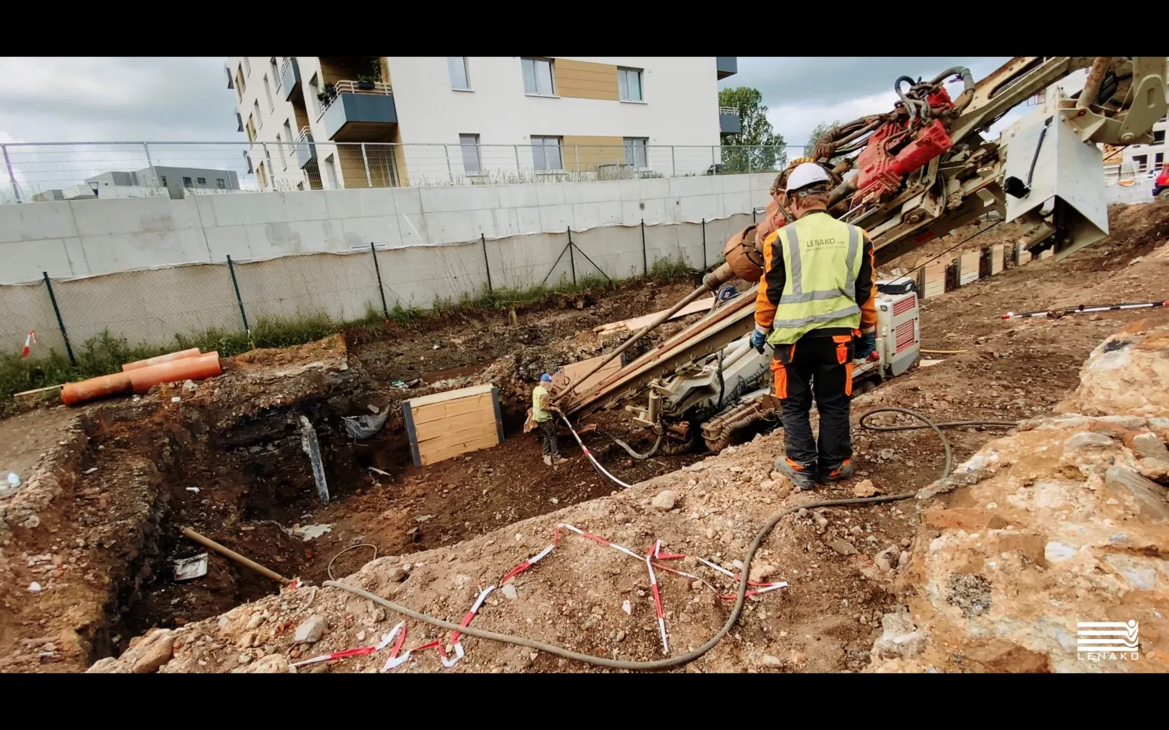 Cílem akce je zajištění jižního výkopu pro výstavbu retenční nádrže v ulici Na Černé Strouze v Praze 9 – Vysočanech, v bývalém průmyslovém areálu ČKD Praha. Projektant předpokládal, že výkopy budou probíhat ve vrstvách navážek a písčitých sedimentů v blízkosti stávajícího horkovodu. Horkovod se nachází přibližně 1,0 m pod terénem. Z důvodu ochrany stávajících konstrukcí a bezpečnosti pracovníků při budování nádrže je prováděno záporové pažení. Pažení je dočasná konstrukce, která bude v zemi ponechána natrvalo. Plocha zápor bude využita jako jednostranné bednění pro provedení monolitické konstrukce retenční nádrže. Před realizací pažení byl proveden předvýkop, aby horní hrana mikrozápor byla pod konstrukční skladbou navržené komunikace. Vzhledem k omezenému prostoru pro pažení, které je dané stávající polohou horkovodu, je projektováno provést pažení z mikrozápor. Mikrozápory jsou z HEB140, oceli S235 dl. 5,5 m v rozteči 1,8 m. Mikrozápory jsou realizovány do vrtů o průměru min. 220 mm. Pata zápor do úrovně výkopu je zalita cementovou zálivkou. Plocha mezi záporami je vyplněna výdřevou tl. 80 mm. Stabilita mikrozáporového pažení je zajištěna pomocí dočasných zemních pramencových kotev v jedné úrovni. Výšková úroveň návrtného bodu kotev je přizpůsobena s ohledem na skutečnou polohu horkovodu. Hlavy kotev jsou opřeny o ocelové převázky.